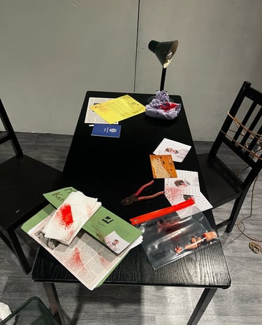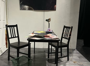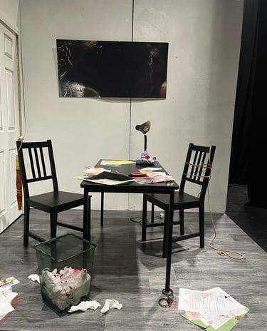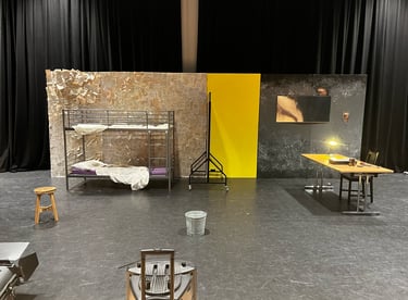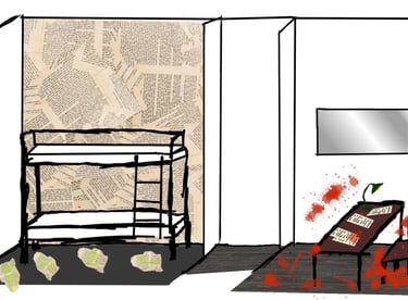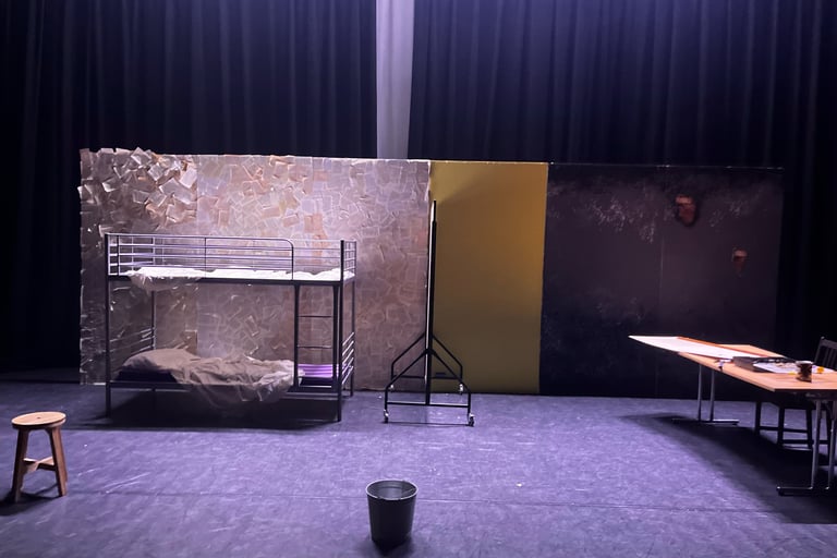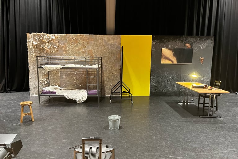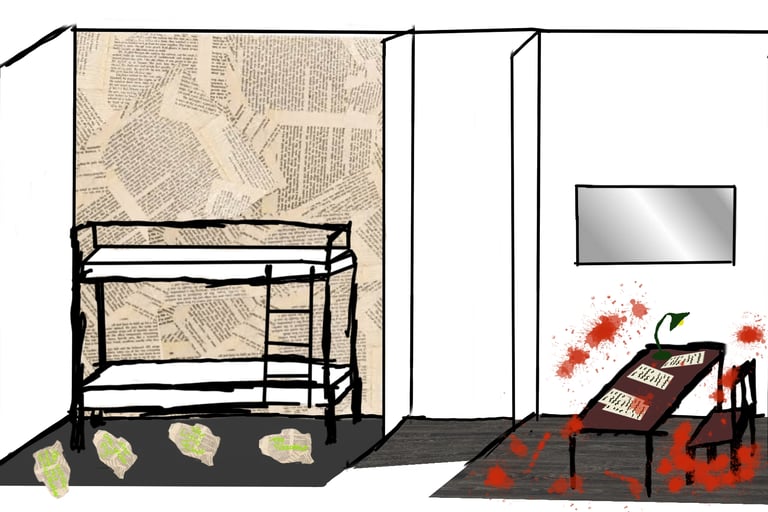 This set design was created for my A-Level Drama final scripted practical exam. The Pillowman is based around two brothers who are accused of the murders of several children due to one of the brothers writing stories that seem similar to their way of death. The play is set in a totalitarian prison so I wanted to show the cruelty and limited materials that the characters would have. I also wanted to demonstrate the mix between fiction and reality and how these books that were written had crept into reality.