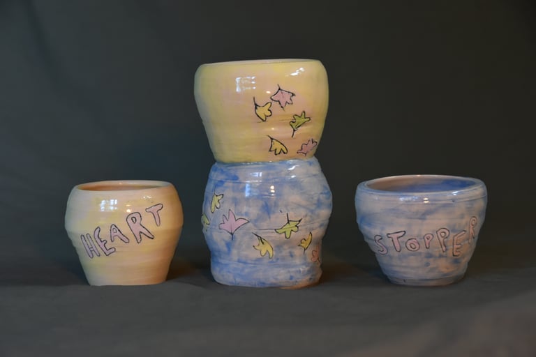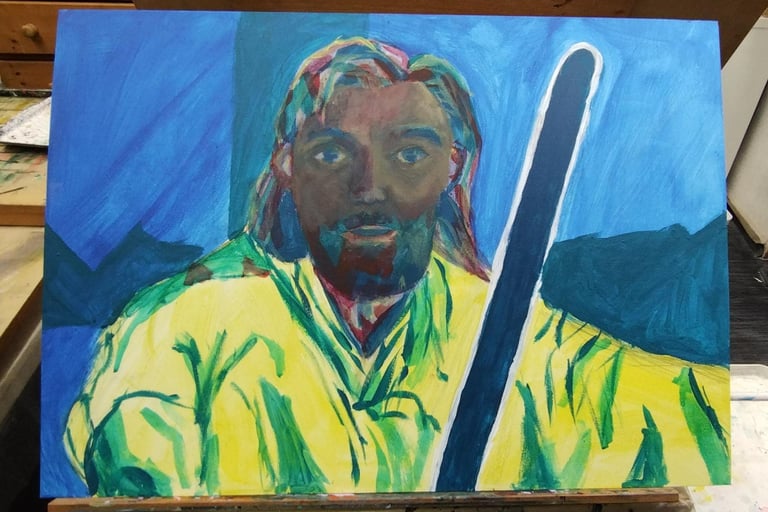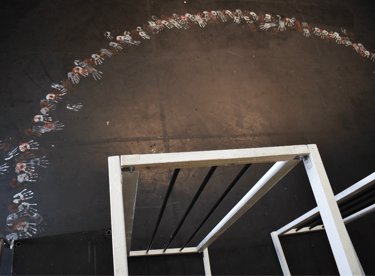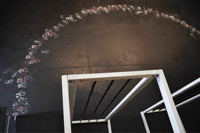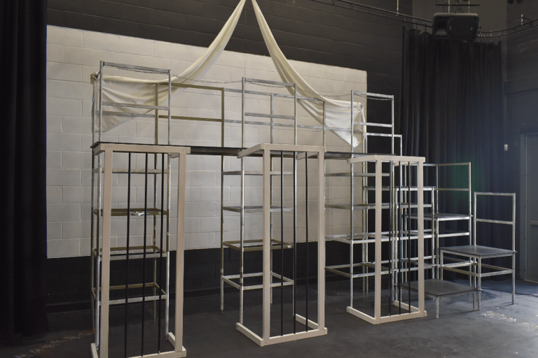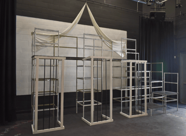 A Set Design was created for an original drama piece written by my group and I for our Drama A-Level. I used a metal frame with cages attached to represent the imprisonment of our characters while using fabric hanging from the ceiling to represent a big top. I also painted hand prints on the floor marking the edge of the stage, demonstrating the Clowns trying to escape their situation.